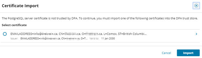 If you select this option and DPA cannot access a trusted certificate, you are prompted to import a certificate into the DPA trust store. Click the arrow on the right to view certificate details.