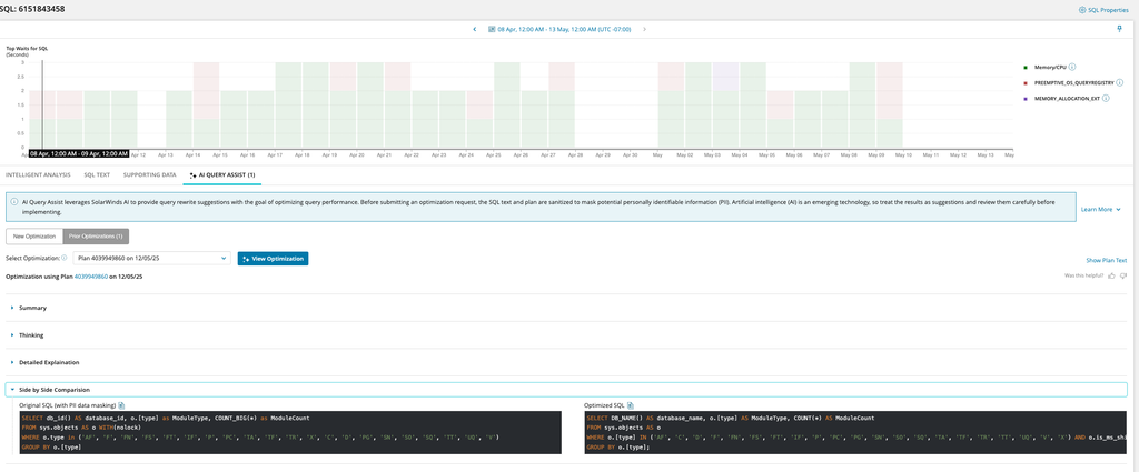 When you connect DPA to SolarWinds Observability SaaS with Platform Connect, you can use the AI Query Assist option to send a query and associated plan to SolarWinds AI for suggestions to optimize its performance. Before the request is submitted, the query and plan are sanitized to mask any potential personally identifiable information (PPI).