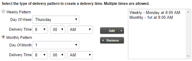 Specify when you want the report delivered, and click Add. You can specify multiple delivery times.