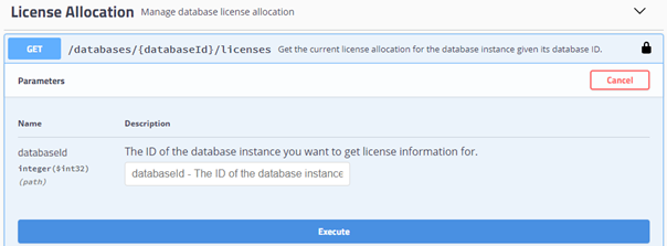 Click the GET/databases/{databaseId}/licenses endpoint to expand it.