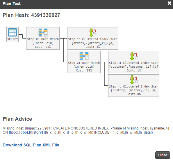 • The Plans tab shows the cached plans that had the most active wait time. Hover over a slice for details. Click a plan hash in the legend to display the plan text (and advice if available) from the database vendor. Examine the plan text to see which steps or operations have the highest cost. Click Download to download the plan.