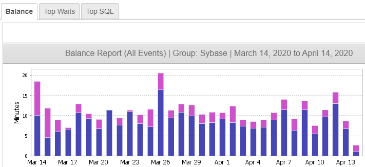 The Balance Report bar graph shows the amount of wait time for each database instance in the group for the past month. Use this report to evaluate load distribution among the group members.
