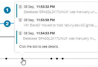To view annotations or information about VMware events (for instances that run on a VM), hover over a dot on the line above a chart. These events can sometimes explain changes in resource metrics. VMware events that occurred on other VMs are shown in plain text. Those that occurred on the same VM are shown in bold text.