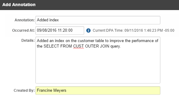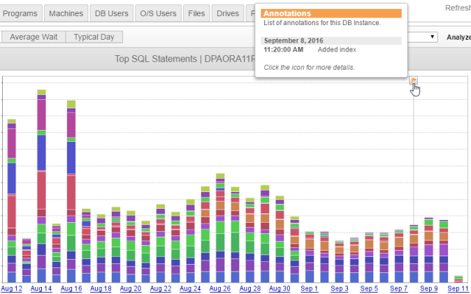 When you make a change that could affect performance (such as adding an index, tuning a query, or adding resources), you can add an annotation in DPA to show when that change was made. The annotations are displayed on all trend and timeslice charts. By comparing performance data before and after the change, you can see what effect the change had.