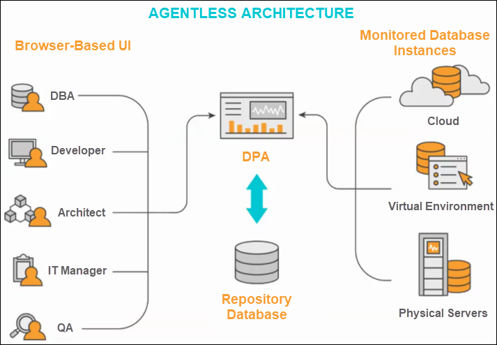 The DPA server collects performance data from a set of database instances you choose to monitor. DPA stores this data in the repository database, and makes it available to users through its web-based interface.