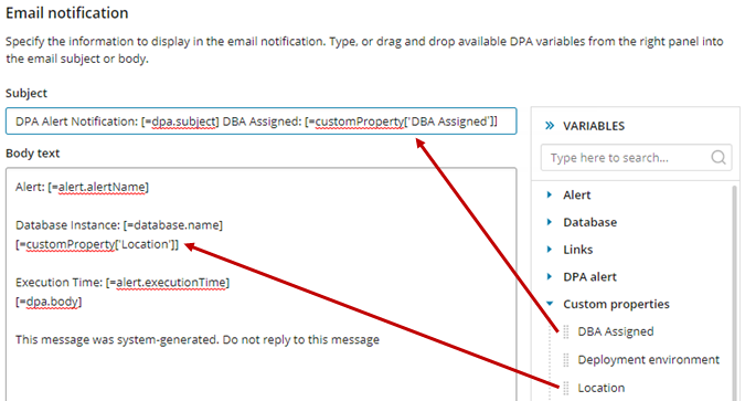 In addition to the predefined variables listed above, you can create custom properties to include other information in alert notification email templates. If any custom properties have been created for this DPA server, they are displayed in the Custom properties section in the Variables list.