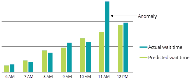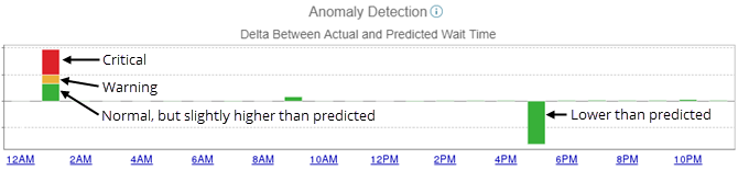 The Anomaly Detection chart for a one-day period shows the differences between the predicted wait times and actual wait times for each hour. The bar for the current hour shows the differences during the six most recent 10-minute intervals (a rolling one-hour time period).