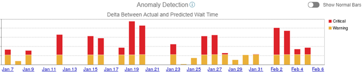 - Open the Anomaly Detection chart for a one-day period, and find the hours with large red segments. These are the hours when wait times were much higher than expected.