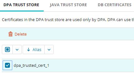 The Trusted Certificate Management page opens. The DPA Trust Store tab lists the alias and expiration data of each certificate in the DPA trust store. You can: