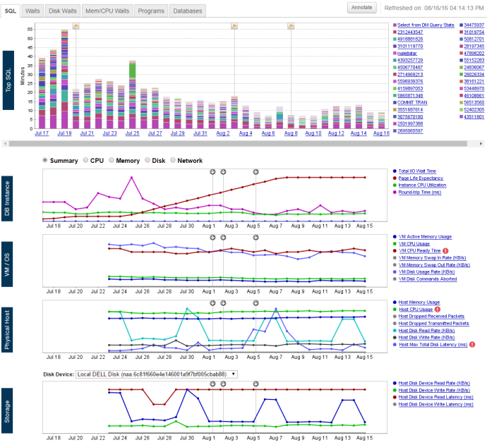 DPA shows performance data from the database instance followed by metrics from the VM, the physical host, and the storage layer. Use these graphs to correlate waits in the database instance with events in the underlying layers.