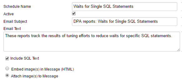 Report schedules automatically email reports (or report groups) at regular intervals. You can send reports to managers, team members, and customers. Use report schedules to communicate database trends to people who do not have direct access to DPA, and to and highlight performance improvements across your organization.