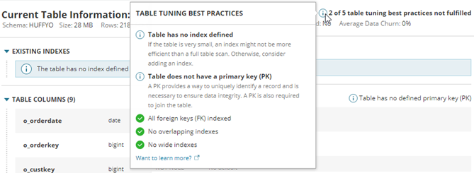 When DPA generates a table advisor, it evaluates the table and its indexes against a set of best practices. Any violations are listed in the Current Table Information section.