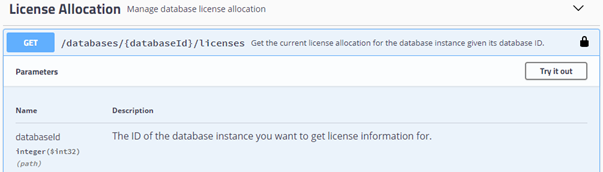 Click the GET/databases/{databaseId}/licenses endpoint to expand it.