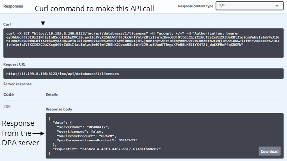 The Response body section shows the response from the DPA server, and the Curl section shows the Curl command (including the access token) that could be run to make this API call.
