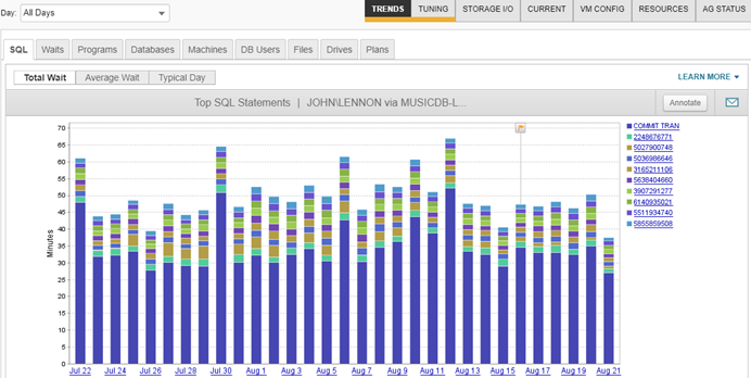 The Total Wait chart on the SQL tab identifies the SQL statements with the highest cumulative wait times during the selected time period. In many cases, these SQL statements have the highest performance impact on end users and applications.