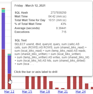 From the one-hour chart, click the identifier to the left of a bar for more information about that entity. For example, on the SQL chart, click the SQL hash or name to view in-depth analysis of that statement. On the Waits chart, click the name of a wait type to see a list of SQL statements that ran during that period with that type of wait.