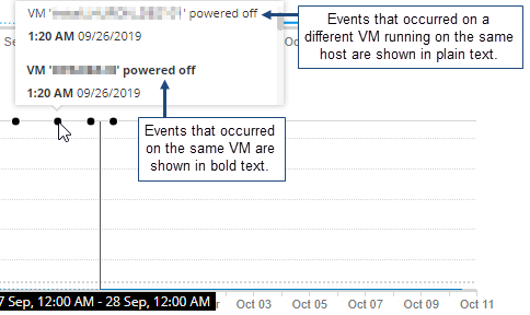 To view annotations or information about VMware events (for instances that run on a VM), hover over a dot on the line above a chart. These events can sometimes explain changes in resource metrics. VMware events that occurred on other VMs are shown in plain text. Those that occurred on the same VM are shown in bold text.